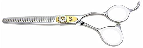 Tobiyaki 6.0- 30 tooth Hair Thinning Shears with offset grip and easy click leaf spring tension adjustment knob. Featuring the Kissaki ultra sharp Convex edge, triple hand honed and hollow ground for durability and Razor sharpness. These Hair Scissors are made from the Highest Quality Japanese SUS 440C Stainless Steel (Rockwell Hardness of 60+) and polished to a brilliant Mirror Finish. All Kissaki Hair Shears come with our beautiful custom shear case including lubricant, finger sizing rings and a leather cleaning - polishing cloth and have a Lifetime Warranty against defects in parts, materials & workmanship.